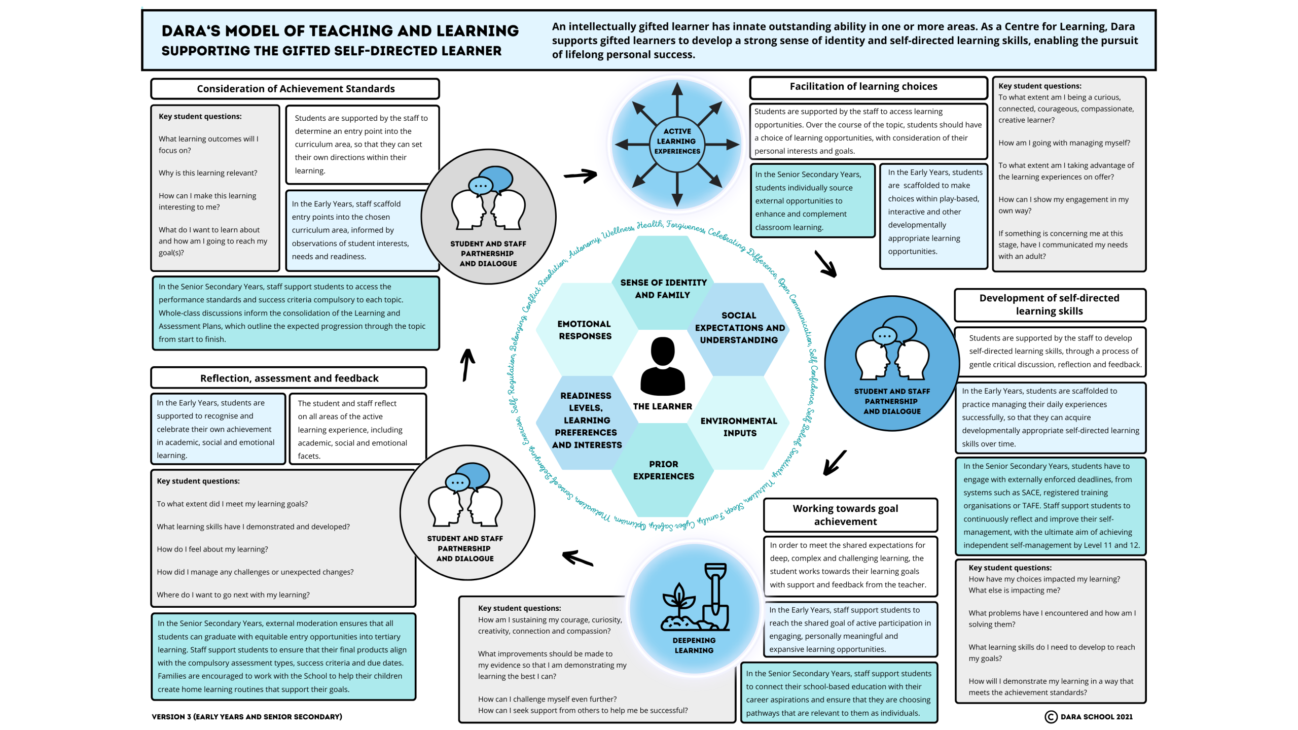 The Dara Model for Teaching and Learning (2021) acknowledges that students bring to school their own individual learner profile. The student’s learner profile is made up of academic readiness levels, individual learning preferences and interests, and other factors that influence who each student is as a learner and how they learn. These aspects are celebrated, developed and embedded in the design of learning.